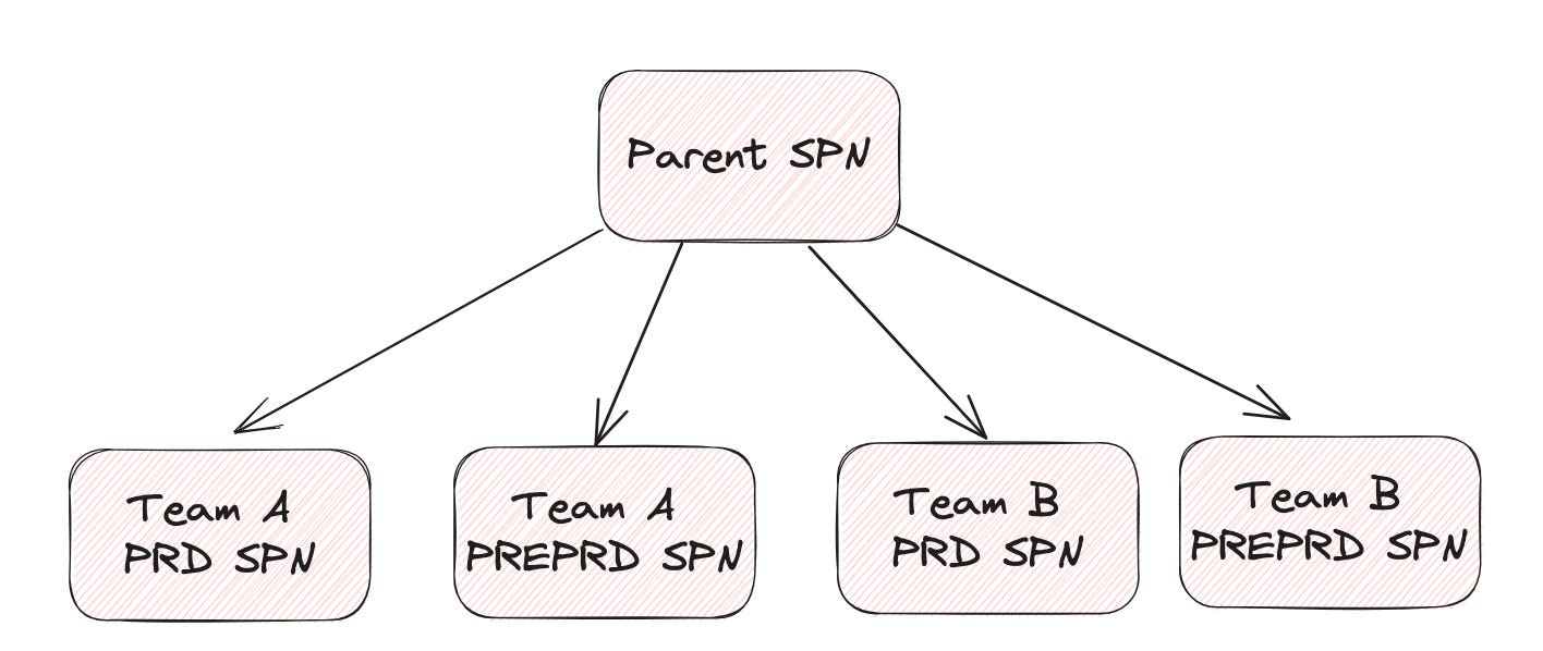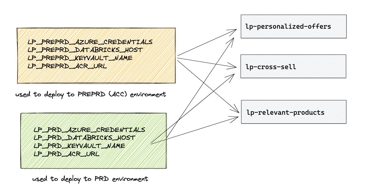 Since environments and service principals are shared, we do not want to store credentials in each separate repository: in case credentials expire/change, we would have to update them everywhere.