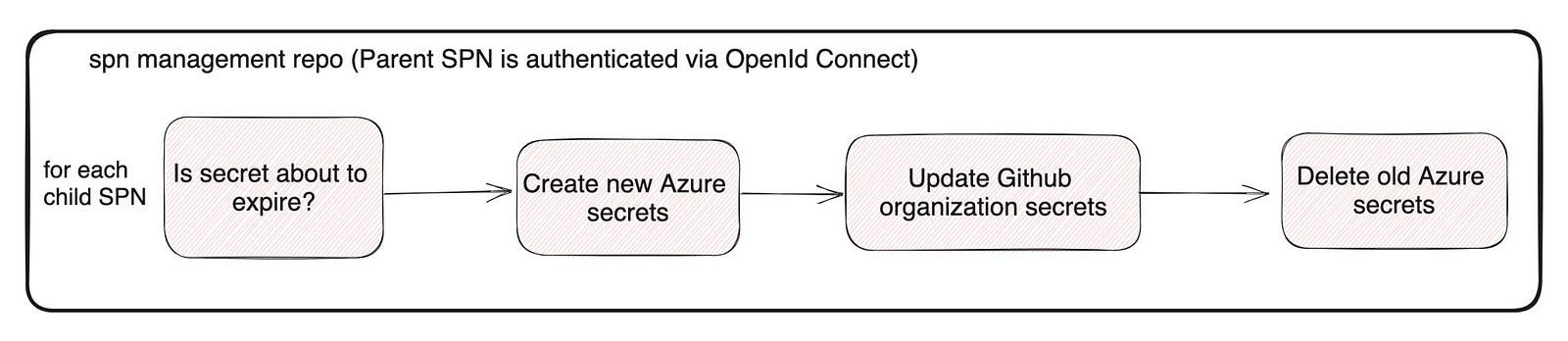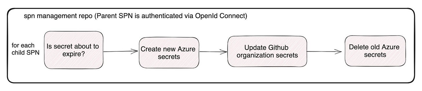 We have a separate SPN management repository where the parent SPN is authenticated via OpenId connect. In that repository, a workflow gets triggered monthly to check whether any of the child SPN secrets are about to expire within a month. If this is the case, a new secret is created, GitHub organization secrets are updated using a GitHub app with necessary permissions, and old Azure secrets are deleted.