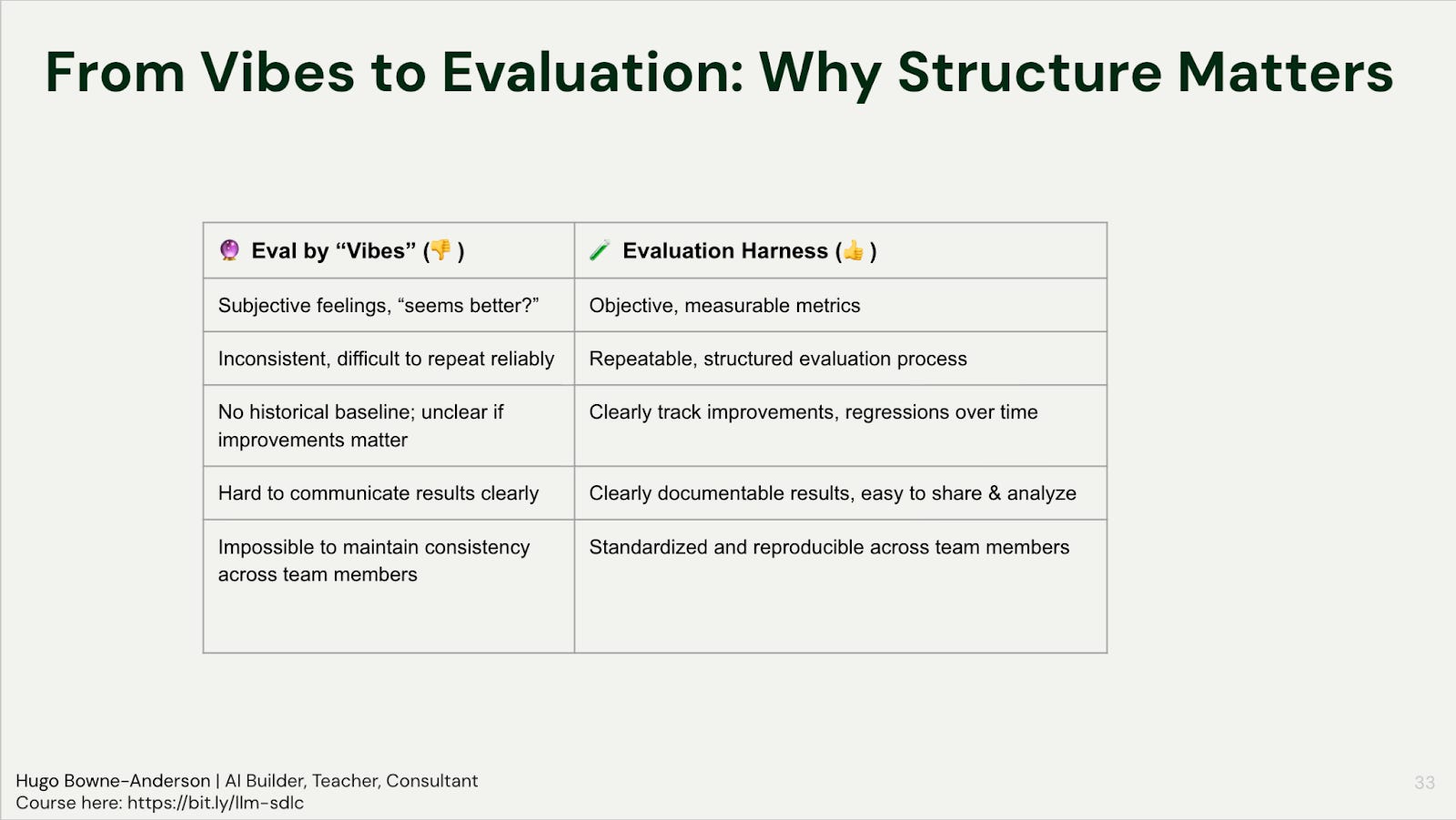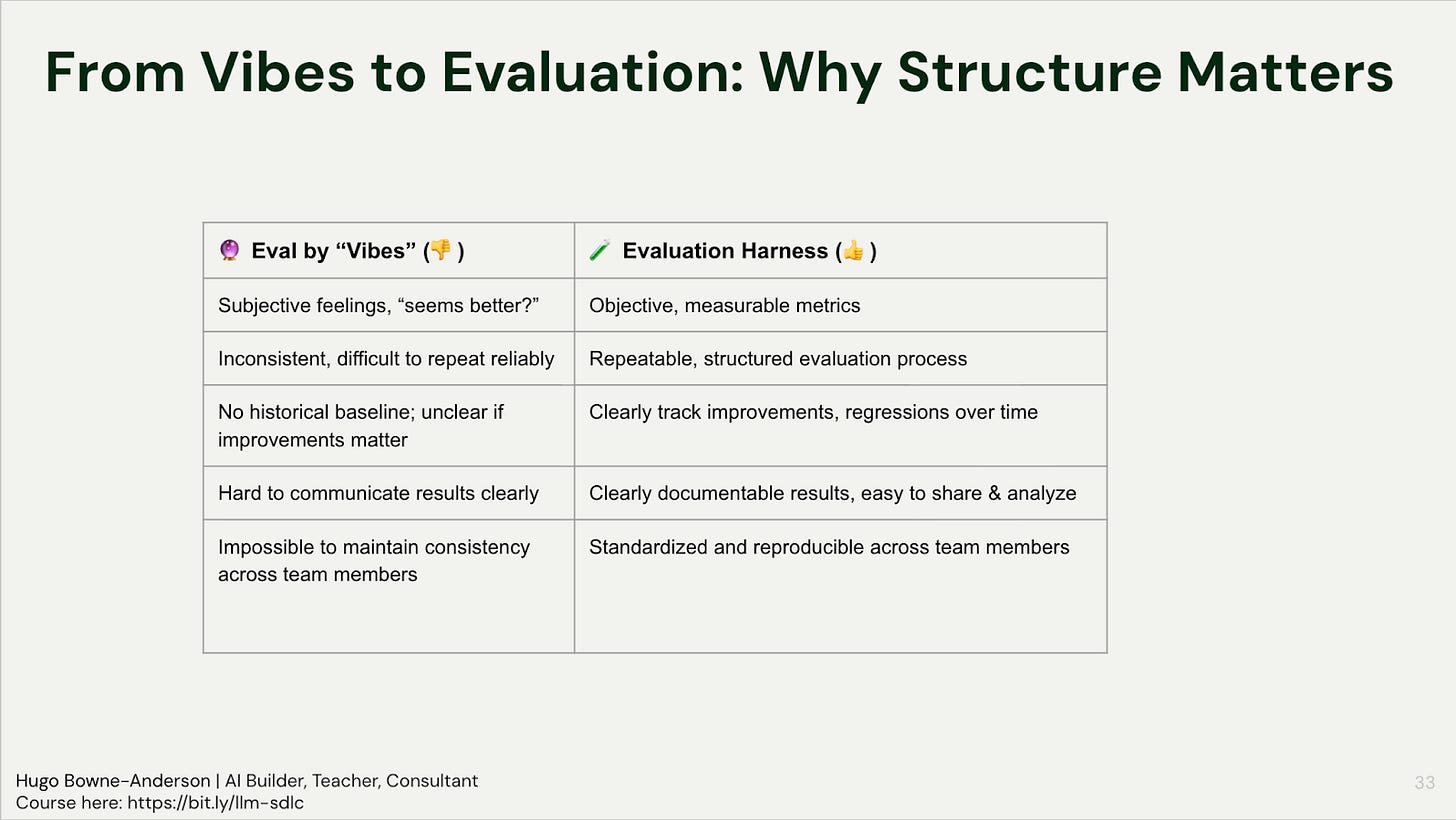 “If your eyes are bleeding from spreadsheets, you’re probably doing LLM evaluation right.” — Philip Carter (Honeycomb, Guest Talk in Course)