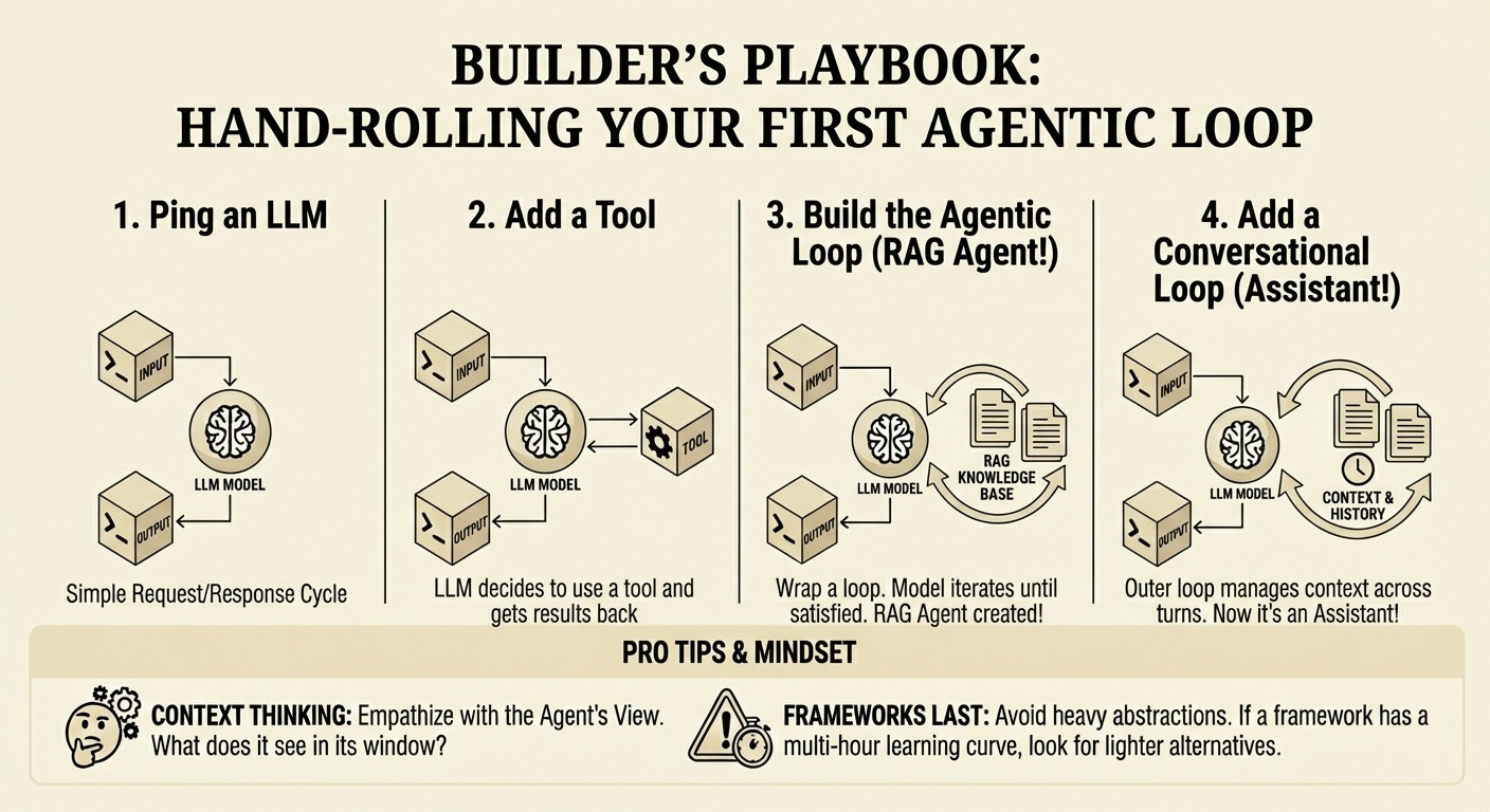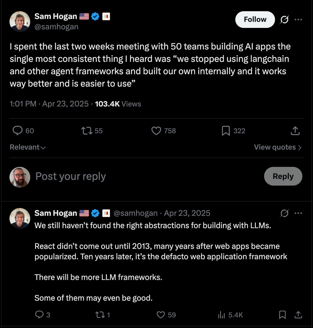 When to add a framework. Only when it demonstrably improves outcomes. After you understand your system’s behavior through direct API calls, you’ll know which parts are tedious and error-prone. That’s where a framework earns its place. Make sure to adopt frameworks that abstract away the code you don’t want to write yourself. And when you do adopt tooling, prioritize observability: being able to see what your system is doing is more important than which framework orchestrates it.