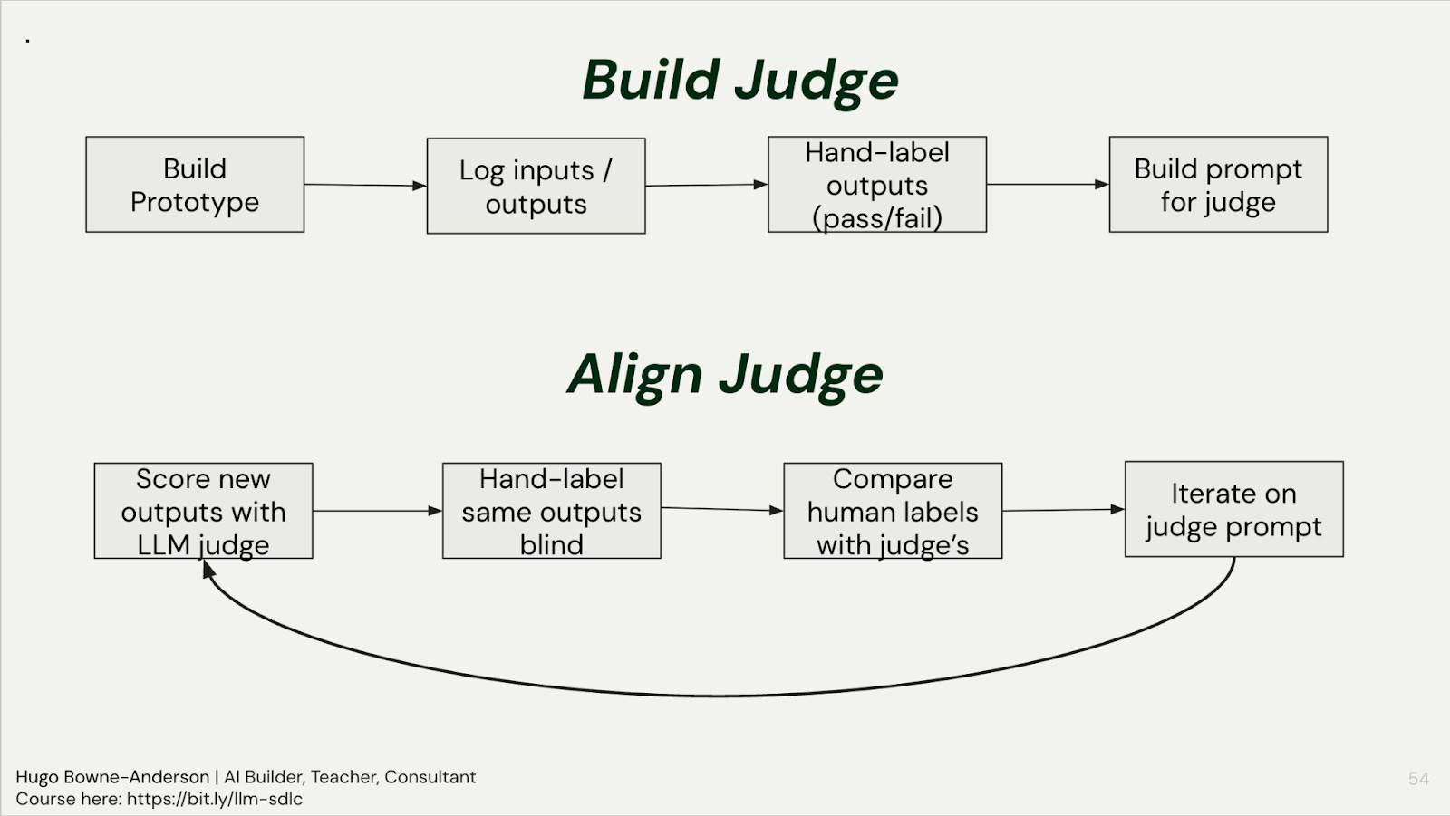An LLM judge is just a prompt that scores another LLM’s output: the key is aligning it with human labels through iteration (run the judge, hand-label the same outputs blind, compare, and refine the judge prompt until they agree), and building one judge per failure mode rather than one judge for everything.